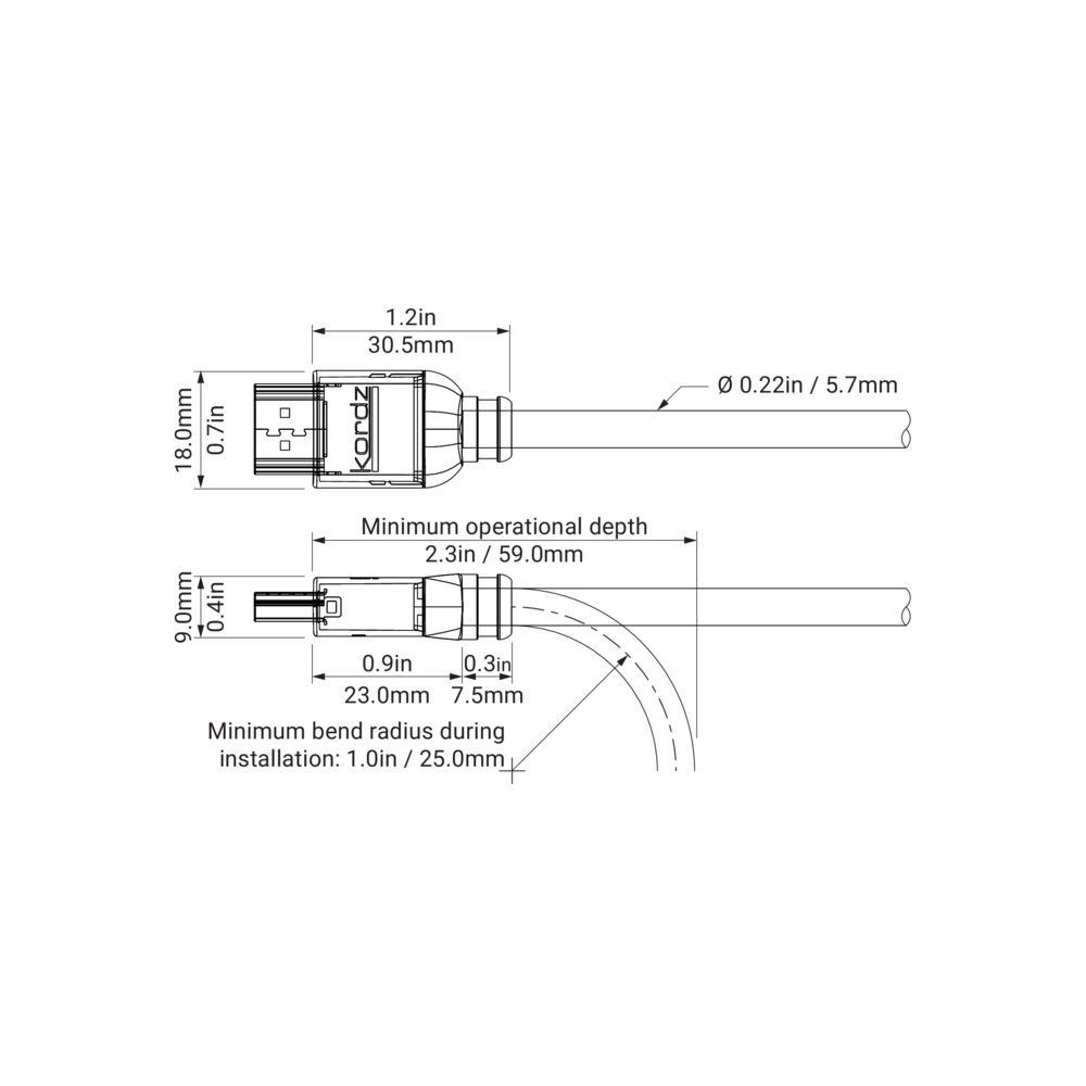 Radio de curvatura del cable: 30AWG 25,0 mm/1,0″ | 28AWG 32,0 mm/1,3″ | 24AWG 72 mm | 2,8″
